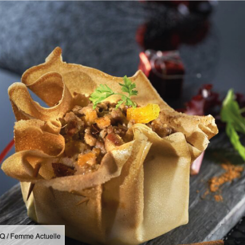 - Laisser refroidir. Garnir les feuilles de brick et les plier façon aumônière.