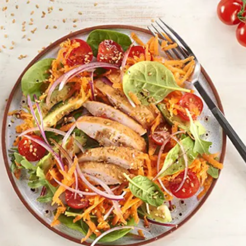- Dans le contenant individuel de votre choix, disposez la salade, puis le demi avocat, les moitié des tomates cerises, la moitié de la carotte râpée et de l'oignon émincé. Nappez de vinaigrette et saupoudrez des graines de sésame.